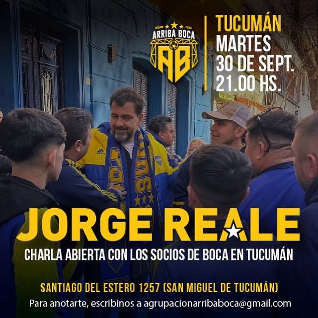 El próximo martes 30 de septiembre, a las 21 horas, el dirigente de Boca Juniors Jorge Reale estará en San Miguel de Tucumán para mantener una charla abierta con socios y socias del club. La reunión será en Santiago del Estero 1257 y se enmarca en una serie de encuentros federales organizados por la agrupación Arriba Boca.